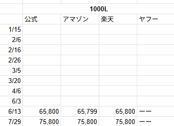 今回の1000Lも同様で、公式が先に値下げを始めたのち、Amazon・楽天が追随する構図となっています。